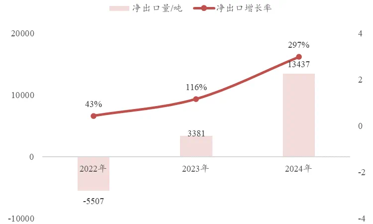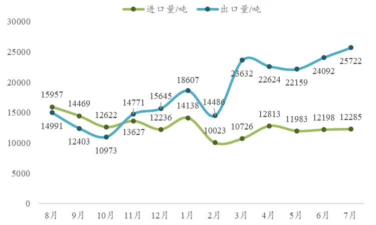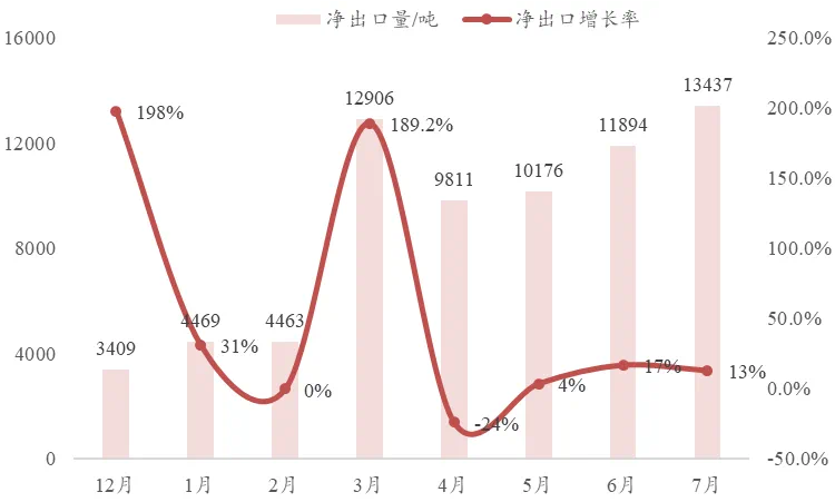 从2023年12月到2024年7月份的八个月时间内,我国环氧树脂净出口量呈现稳步递增趋势,出口态势持续向好。