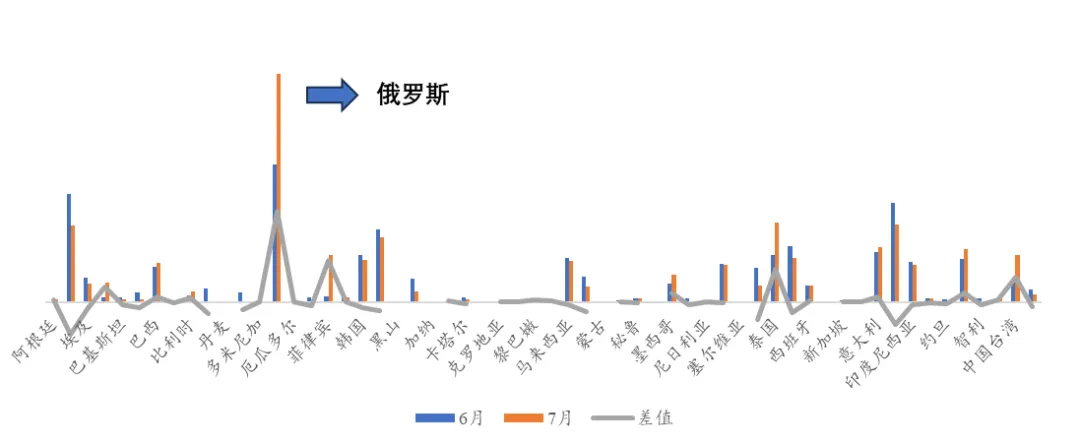 通过对6、7月份的环氧树脂出口国家的出口量进行比较,发现我国对俄罗斯环氧树脂进口量由3033吨增长到5051吨,增长量为两千多吨,同比增长66.5%。