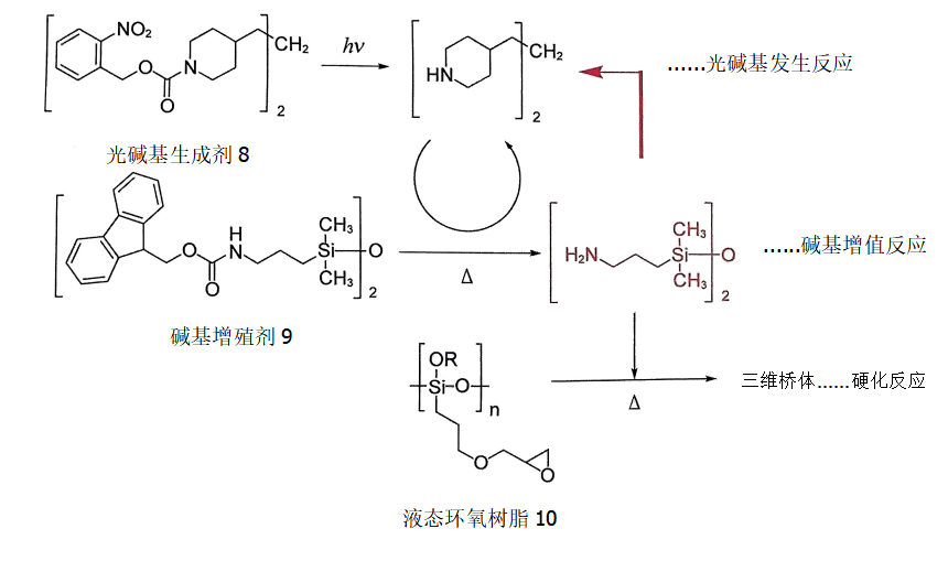 以由光碱基发生剂8和液态环氧树脂10构成的光阴离子硬化材料为例,阐述加入碱基增殖反应时的效果。由光碱基发生剂8、碱基增殖剂9以及树脂10组成的液态涂膜,在UV光照射下,首先从8产生少量的胺以光化学方式产生(光碱基发生反应)。对涂膜进一步加热,光化学产生的少量胺成为诱因,引起化合物9的碱基增殖反应,新的二胺增殖生成(碱基增殖反应)。此时,涂膜中发生的胺与树脂10的环氧基的加成反应进行,树脂10变化为三维交联体,涂膜发生硬化。另外,树脂10的碱基反应部位除环氧基外,还有残存的烷基硅基。由于这种烷基硅基在碱基催化的作用下发生水解缩合,所以树脂10的环氧基和烷基硅基这两个官能团对涂膜的硬化做出了贡献。